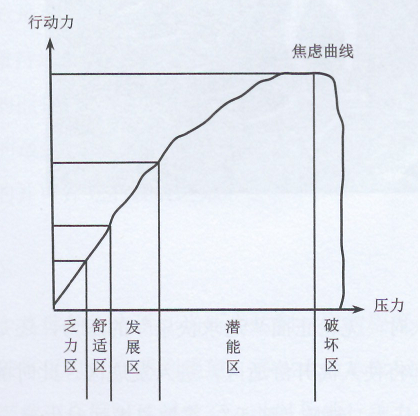 就某一個具體的人來講,當(dāng)壓力達到一定的程度,超過焦慮曲線的頂峰而處于破壞區(qū)時,會感到絕望,再也無力承受與支撐下去,于是,他的意識與潛意識會同時選擇放棄。此時他的行動力會突然遭到毀滅性破壞,驟然直線下降,直到為零。比如,他認為“這絕對不可能”而放棄努力,因過度緊張而動作變形,甚至一下被“嚇癱了”,因為承受不了巨大的壓力而精神失常等現(xiàn)象,即是因為壓力進入了他的“破壞區(qū)”的結(jié)果。